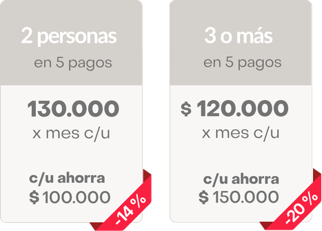 Los descuentos grupales aplican cuando al menos uno de los participantes es nuevo. Si ya cursaste RE en una generación anterior y venís con alguien nuevo, el descuento aplica para ambos.¿Preferís pagar en dólares? Aceptamos transferencias en USD vía Wise o GrabrFi, y pagos en USDT. Escribinos y te damos los datos.